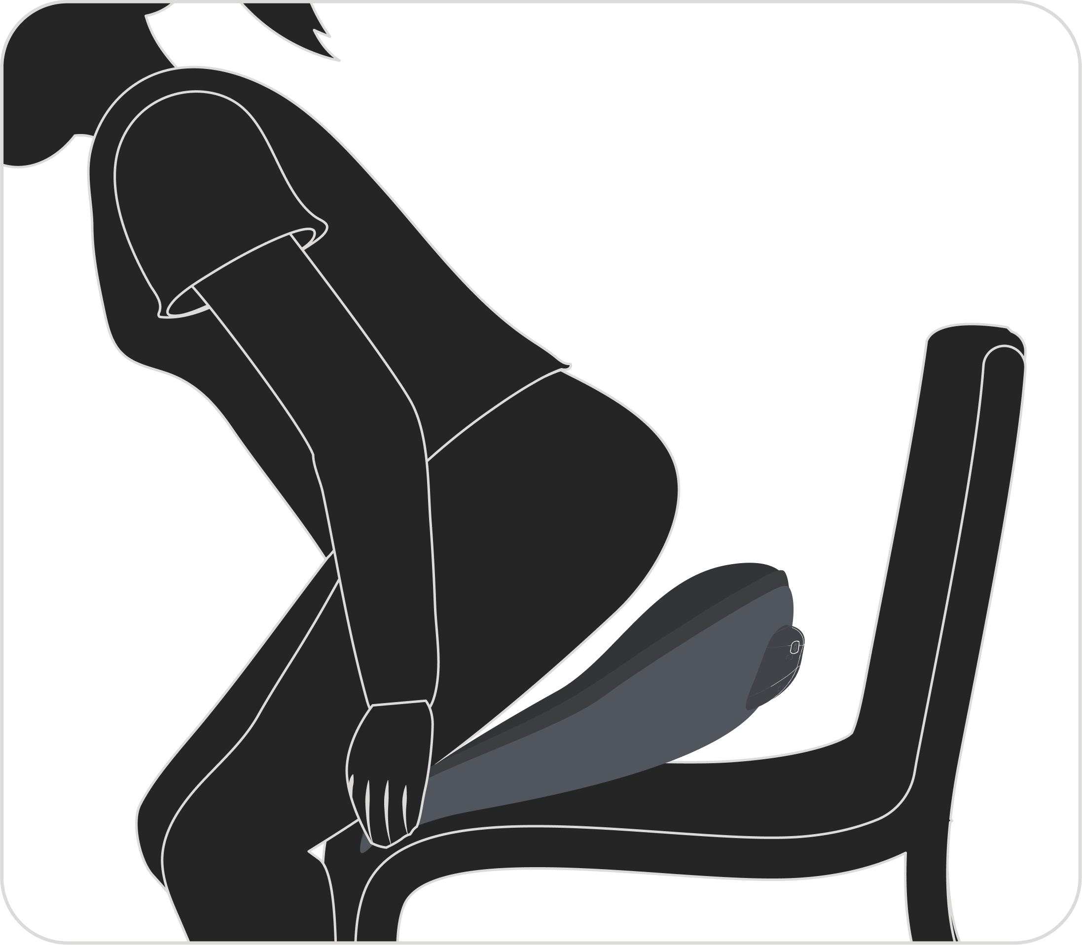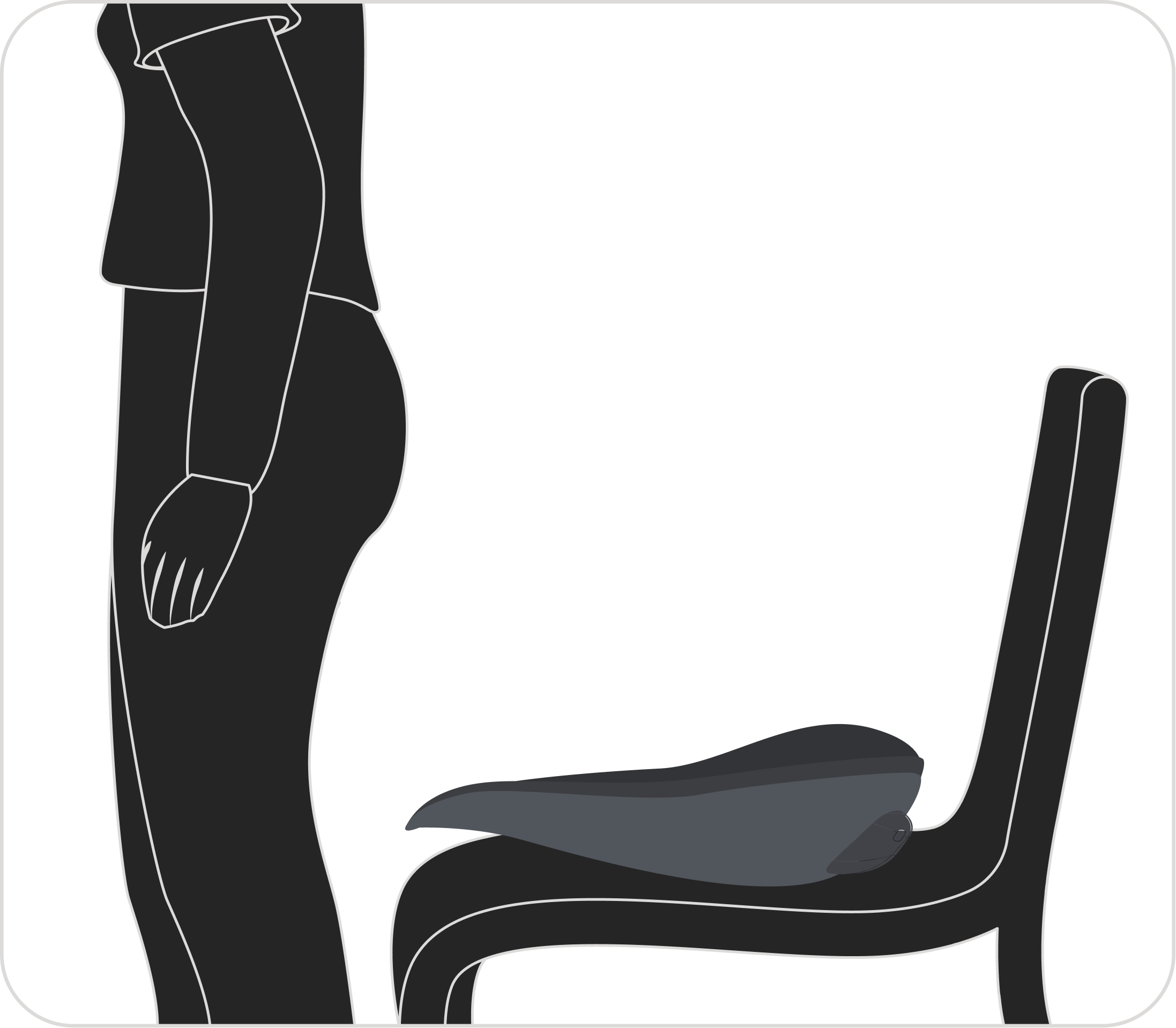 Halten Sie beide Seiten fest, setzen Sie sich langsam auf den Sitz und richten Sie Ihr Steißbein an der oberen Kante aus. Achten Sie darauf, dass Ihre Hüften vollständig auf der Sitzfläche aufliegen und keine Zwischenräume entstehen, um die maximale Funktionalität zu gewährleisten.